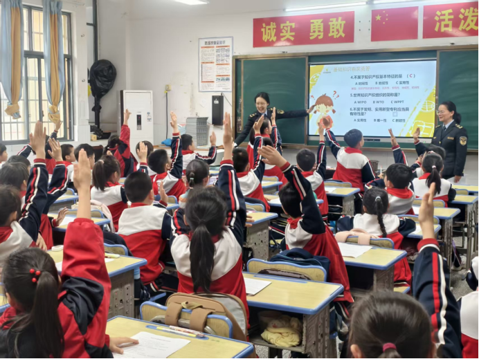 随后进行的“知识产权小达人”知识竞答环节将气氛推向高潮。竞答题目涵盖专利、商标、版权等基础内容,形式多样、贴近生活。学生们踊跃举手、争相答题,在紧张愉快的氛围中巩固了所学知识。工作人员还为积极参与的学生准备了文具套装、知识产权科普读本等纪念品,鼓励他们成为知识产权的“小小宣传员”。