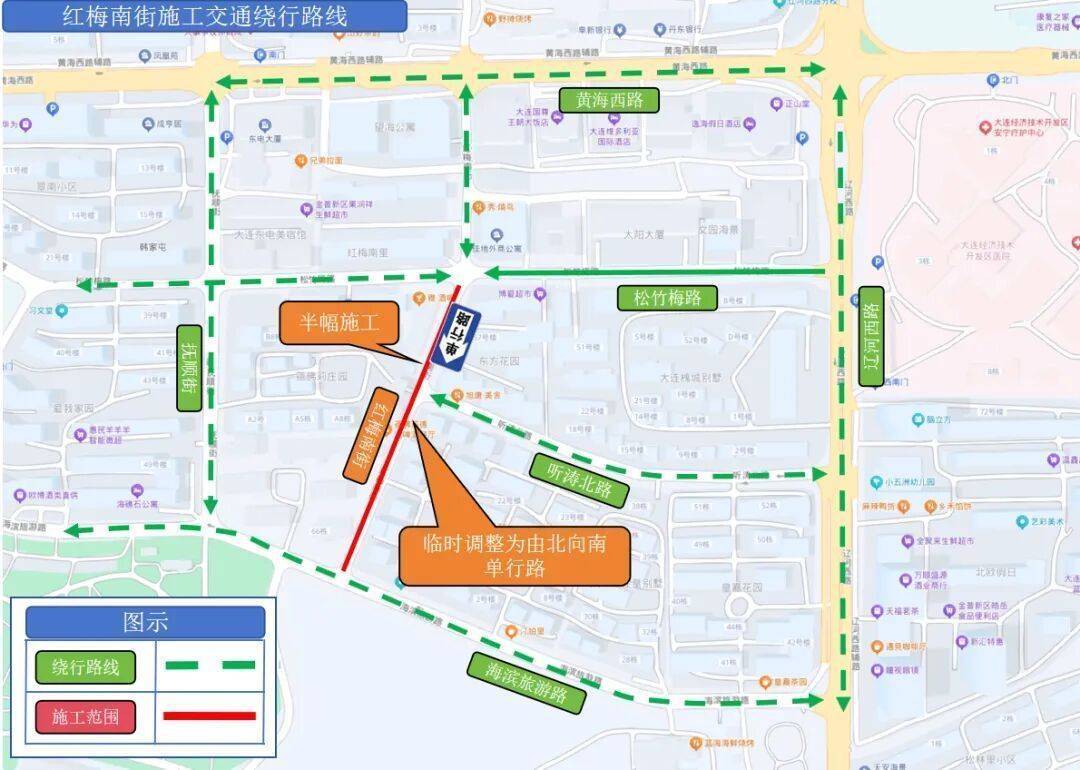因金普新区经开区和金石滩度假区老旧市政供水管网更新改造工程施工需要,大连公安交管支队金州大队决定,自4月27日至5月26日,对红梅南街(松竹梅路——海滨旅游路)西侧道路进行半幅封闭施工;松竹梅路至海滨旅游路方向单向通行,具体行车线路详见导行图。