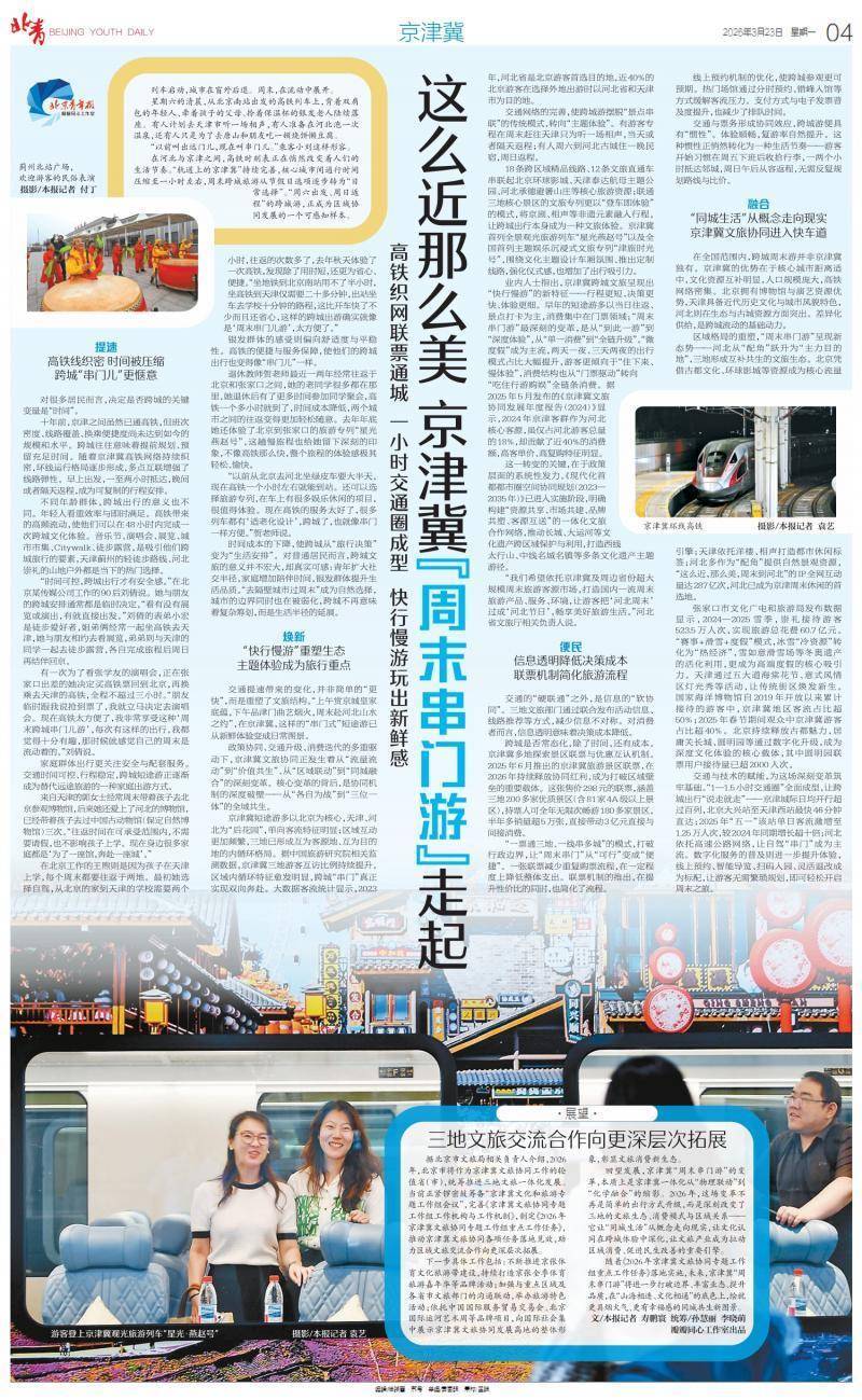 随着《2026年京津冀文旅协同专题工作组重点工作任务》落地实施,未来,京津冀“周末串门游”将进一步打破边界、丰富业态、提升品质,在“山海相连、文化相通”的底色上,绘就更具烟火气、更有幸福感的同城共生新图景。