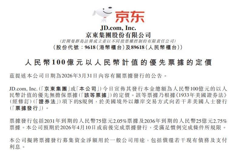 【大河财立方消息】4月2日,京东集团在港交所公告,完成发行100亿元优先票据定价。其中2031年到期的75亿元票据,利率2.05%,以及2036年到期的25亿元票据,利率2.75%,预计4月10日前后完成票据发行,受满足惯例完成条件所规限。